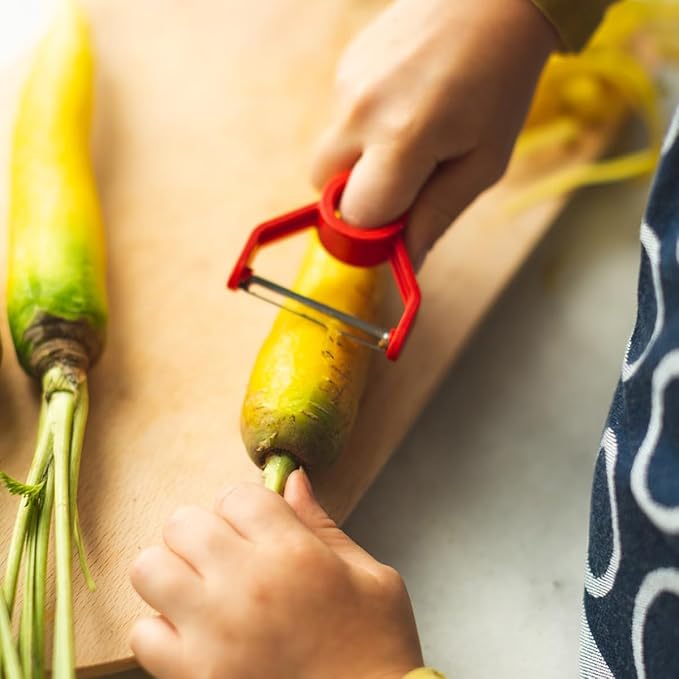 • PEELER: Rounding out Le Petit Chef set is the single finger-pulled peeler, perfect for peeling veggies, fruits, and other prep work. With single handed control, helpers keep their fingers safe and learn proper technique