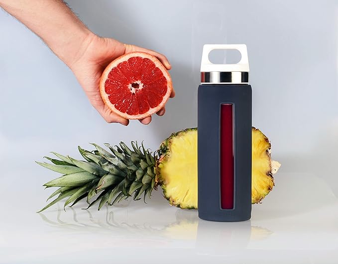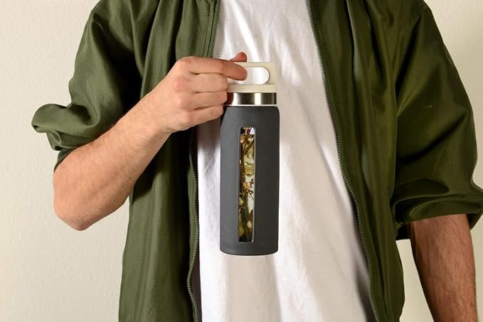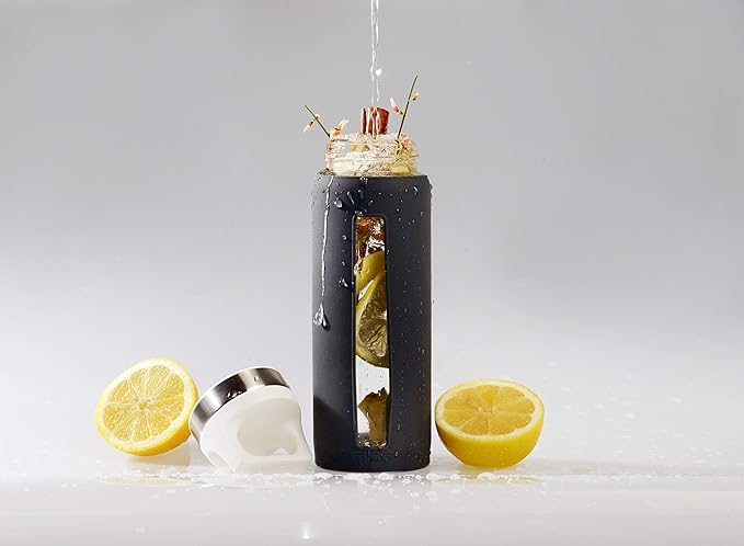 • RESISTANT & DISHWASHER SAFE: This grey water bottle is made out of high-grade broscilate glass. Its silicon cover offers a nice grip and protection in the event of slipping away. Extremely durable, heat resistant and dishwasher safe.