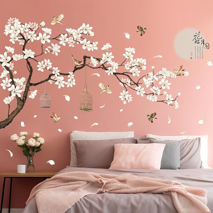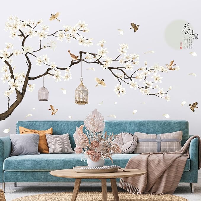 Chinese Style White Flowers Black Tree and Flying Birds Wall Stickers Removable DIY Wall Art Decor Decals Murals for Offices Home Walls Bedroom Study Room Wall Decaoration, 50inchx74inch