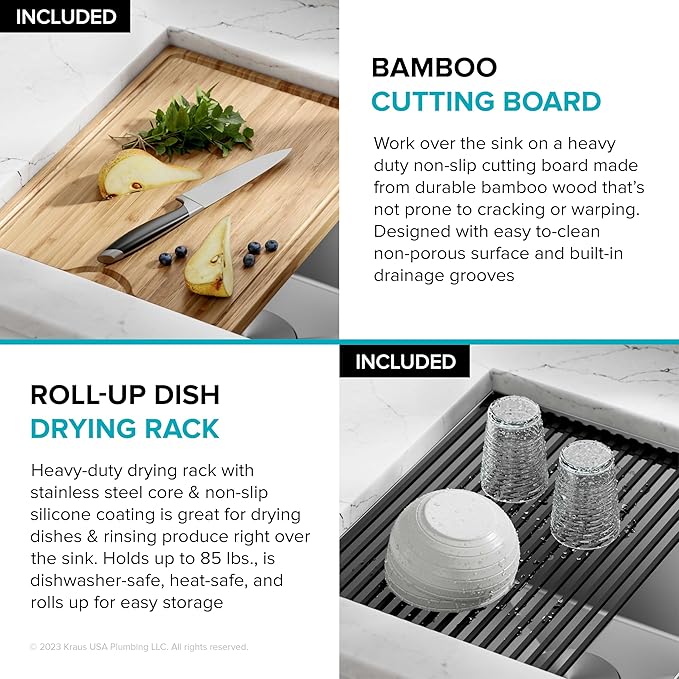• WORKSTATION SINK with integrated ledge for sliding accessories allows you to work right over the sink while minimizing clutter on the kitchen counter – Chop and slice on the durable bamboo cutting board or dry dishes on the heavy-duty rolling mat