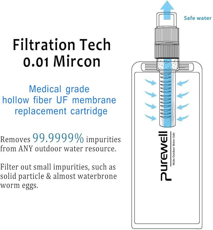 • 【PREMIUM FILTERING SYSTEM】: Purewell Water Filter use 0.01 Microns ultra-filtration membrane cartridge, meet EPA standards. Improve water taste and offer healthy drinking water. The filtered water bottle could reduce the tiny impurities in tap water and improve water taste at home and office.