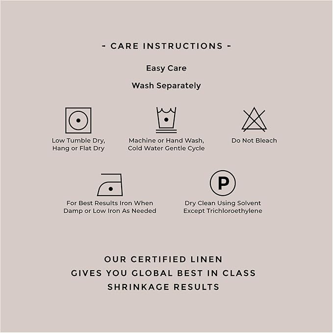 • CARING FOR LINEN - Machine washable, low iron as needed, steam iron for crispness. Gets softer and stronger with each wash. Linen is known for its natural slub texture and wrinkles which add to its relaxed, lived-in look. Slight variations inherent in natural linen enhance the uniqueness of each piece.