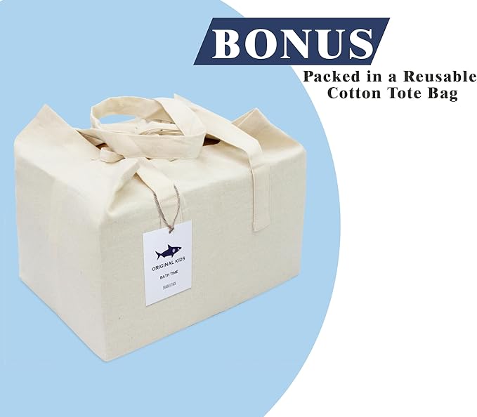 • SET CONTAINS: Two (2) ORIGINAL KIDS- Kids Shark Bath Towels, Two (2) Matching Hand Towels, Two (2) Matching Wash Cloths and one (1) Reusable Canvas Tote Bag