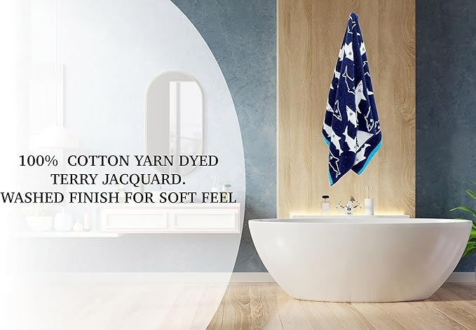 6 Piece Towel Set - Bath Time Shark Attack- 2 Bath Towels, 2 Hand Towels, 2 Washcloths in Bonus Tote Bag- 100% Cotton Jacquard Soft Absorbent Quick Dry Pool Beach Towel Gift - Navy Blue