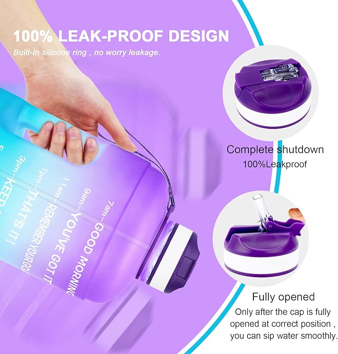 • 【 MOTIVATIONAL TIME MARKER】With unique inspirational quote and time marker, QuiFit one gallon water bottle with straw is great for measuring your daily intake of water, reminding you stay hydrated and drink enough water throughout the day. 1 gallon water jug with time marker is a must have for the gym, sports, yoga, hiking, camping, & traveling.