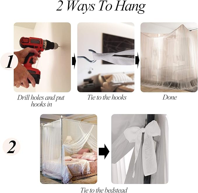 • ๐—˜๐—ฎ๐˜€๐˜† ๐—œ๐—ป๐˜€๐˜๐—ฎ๐—น๐—น - with 2 WAYS TO SET UP: You can install the canopy easily into the ceiling with the provided 4 hooks and wall plugs OR hang it from the corners of your four-post bed for an added touch of style and elegance.