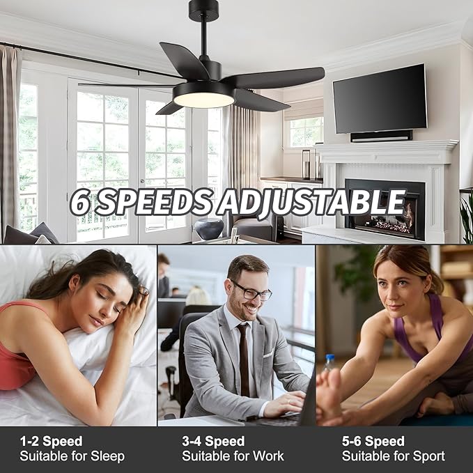 • REVERSIBLE & QUIET DC MOTOR: In summer, it can quickly cool down with air conditioning and is 75% more energy efficient than traditional ceiling fans; in winter, it can quickly warm up the room with heating airflow. Noise of black ceiling fans is less than 35dB