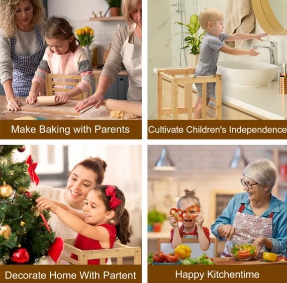 • MADE TO LAST: This sturdy tower stool for learning is made from solid natural bamboo with a child-safe, meticulous finish that prevents scratches and scuff marks. Safely supports 150 lbs for toddlers 18 months to 3 years old.