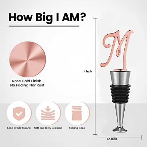 Monogram Wine and Beverage Bottle Stopper, Initial letter wine stoppers Decorative, Creative Wine Gift for Kitchen Bar Wedding Rose Gold Finish,Reusable, letter M