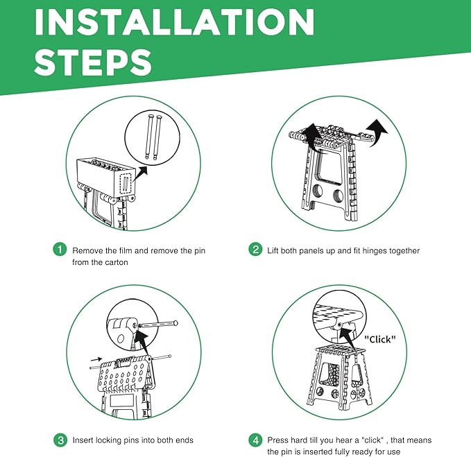 • 【High Load Capacity】Our Solid Strength folding step stool, equipped with a patented pin structure, delivers unparalleled stability. Reinforced with locking pins and sturdy hinges, the stool confidently supports up to 400lbs. Enjoy enhanced safety and stability for all your reaching needs.