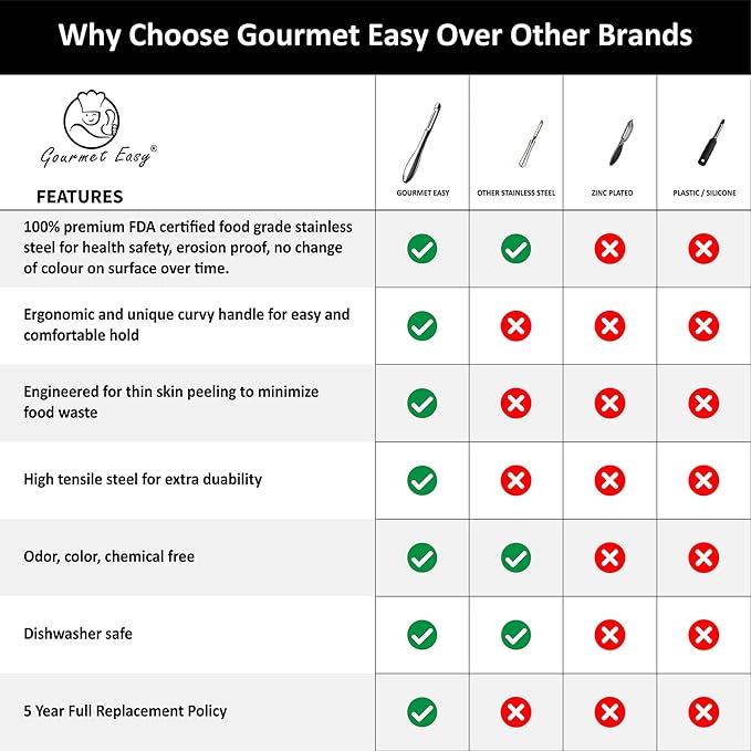 • GOURMET MADE SIMPLE: At Gourmet Easy, we're dedicated to simplifying gourmet cooking experiences. We believe that creating delicious meals for your loved ones should be a fun journey, not a daunting task. Share the joy of cooking with your loved ones with our Gourmet Easy Peeler!