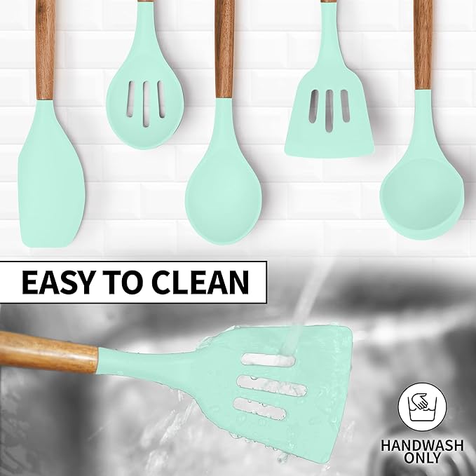 Zulay Non-Stick Silicone Cooking Utensils Set with Authentic Acacia Wood Handles - 5 Piece Silicone Kitchen Utensils Set (Aqua)