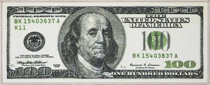 • [TRENDY STYLE]: This Colorful Money Money Rug features a 100 dollar bill print in shades of green and gray on a beige background while also adding color and enhancing the look of your home. Its timeless design can be integrated into a variety of home décor styles.