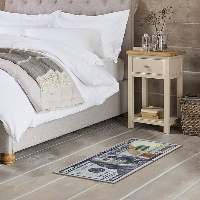 • [TRENDY STYLE]: This Colorful Money Money Rug features a 100 dollar bill print in shades of green, gray, gold, and blue while also adding color and enhancing the look of your home. Its timeless design can be integrated into a variety of home décor styles.