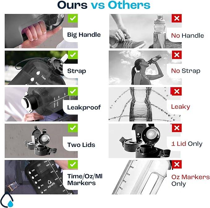 • Track how much you drink - Our half gallon water bottles come with clear time markers on the side so you can see your daily water intake and stay on track to meet your health and fitness goals.