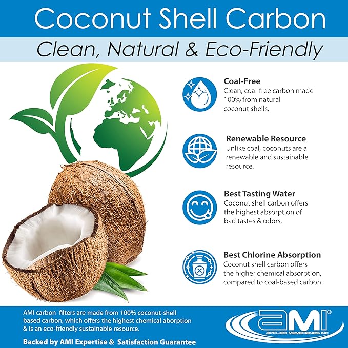 • CHARCOAL-FREE, PLANET-FRIENDLY CARBON: Each carbon filter is made from coconut shell carbon, a sustainable, renewable resource that works better than charcoal at removing bad odors and chemicals from your water.