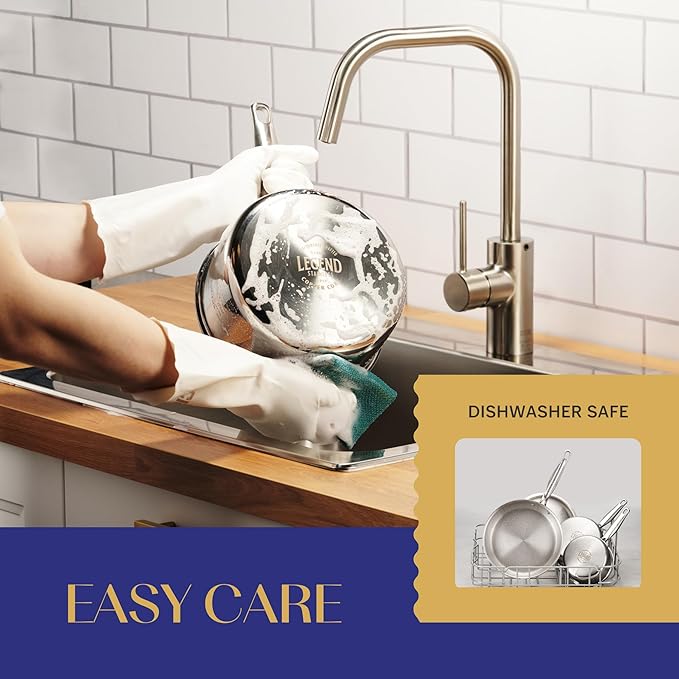 • EASY TO CLEAN & CARE FOR. To maintain the quality of your Legend cookware, allow to cool completely to room temperature. Clean with dish detergent and a sponge or soft mesh scrubber. To maintain luster, polish with water or baking soda and a mild acid, like vinegar or lemon juice. Dishwasher safe, but handwashing is best. Stainless steel copper core pots & pans require no special handling, unlike cast iron, pure copperware, enameled and nonstick clad cookware.