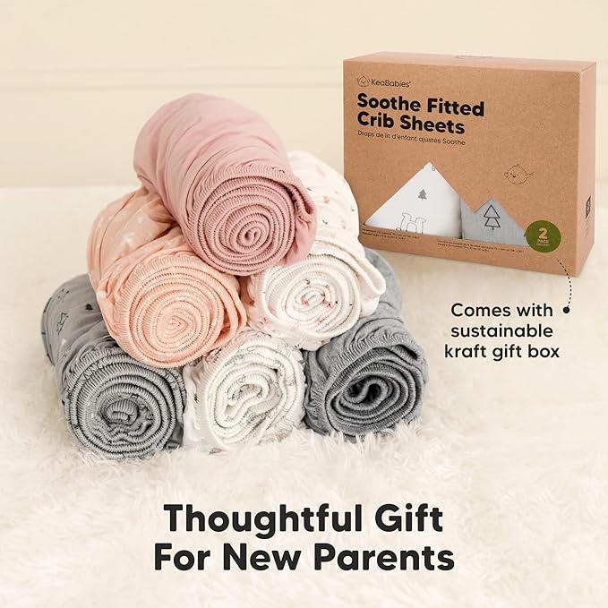 • 2-Pack Fitted Crib Sheets - Each KeaBabies Soothe Baby Crib Sheets set comes with two organic crib sheets for boys and girls that can perfectly fit the standard nursery crib mattresses sized at 52” x 28” and height of 3” to 8”.