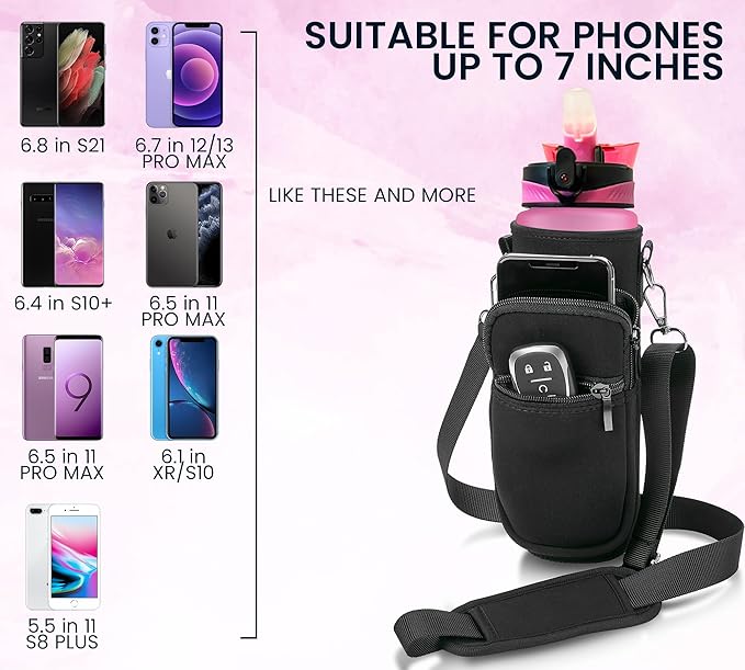 • 𝐖𝐀𝐓𝐄𝐑 ππŽπ“π“π‹π„ π‡πŽπ‹πƒπ„π‘ π–πˆπ“π‡ 𝐒𝐓𝐑𝐀𝐏: The bottles come with a 6mm neoprene sleeve and a padded shoulder strap that helps keep the bottle on the go and provides an extra layer of protection. The water Bottle is not insulated but the sleeve will keep the water cold for up to 4 Hours. It will also avoid condesation and has 2 zipper pockets to store your keys, money and or phone.