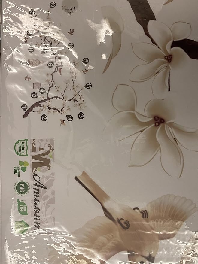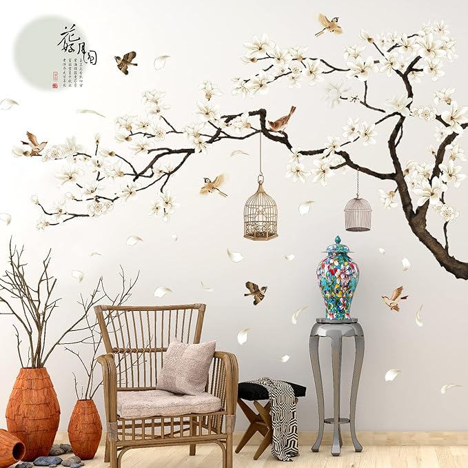 Chinese Style White Flowers Black Tree and Flying Birds Wall Stickers Removable DIY Wall Art Decor Decals Murals for Offices Home Walls Bedroom Study Room Wall Decaoration, 50inchx74inch