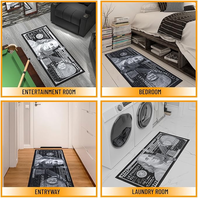 • [TRENDY STYLE]: This Colorful Money Money Rug features a 100 dollar bill print in shades of black, white, and gray while also adding color and enhancing the look of your home. Its timeless design can be integrated into a variety of home décor styles.