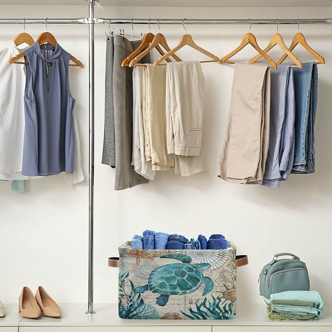 Sea Turtle Storage Basket Fabric Storage Bin Nautical theme Baskets Coastal Starfish Foldable Storage Boxes Organizer Bag for Baby Cloth Dog Toy Book Storage Cubes Shelf Closet Basket 16×12×8 Inches