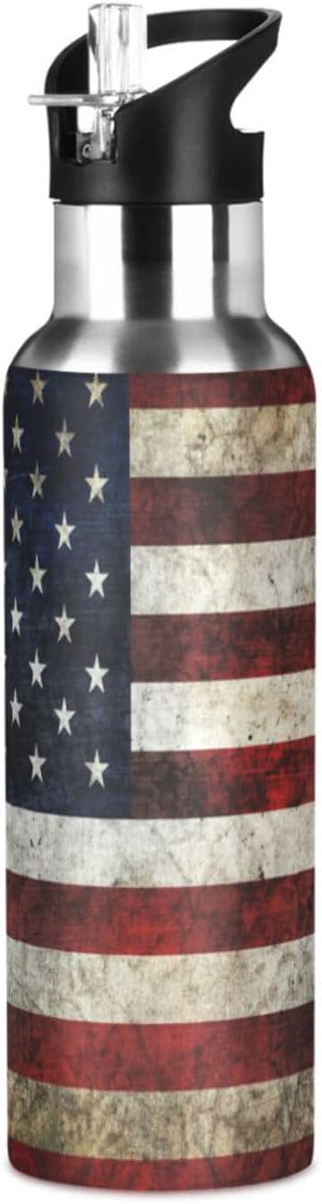 Alaza American Flag Patriotic Water Bottle With Straw Lids Boys Girls,Vacuum Insulated Leakproof Stainless-Steel Sports Bottle Thermal Flask For Gym Yoga Camping,34Oz (1000Ml)
