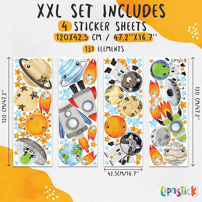 • 🌕 Space wall decal includes: sun, planets, satellite, spaceship, rockets, astronaut animals, asteroids, stars and constellations. Item sizes range from 2" x 2" to 23.2" x 23.2", for a total of 131 items. Solar system stickers come in a cardboard package in 4 sheets. Sheet size is 47.2" x 16.7". This set of wall stickers is size XXL and its size on the wall is 157" x 98"