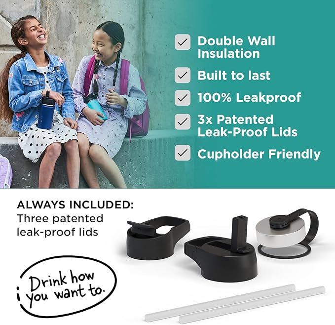 • 3 LIDS: YES, Iron Flask comes with THREE different LEAK PROOF lids. Carabiner Straw Lid with 2 Straws, Flip Lid, and a Stainless Steel Lid! *NOTE: The stainless steel lid is plastic from inside and stainless steel from outside*