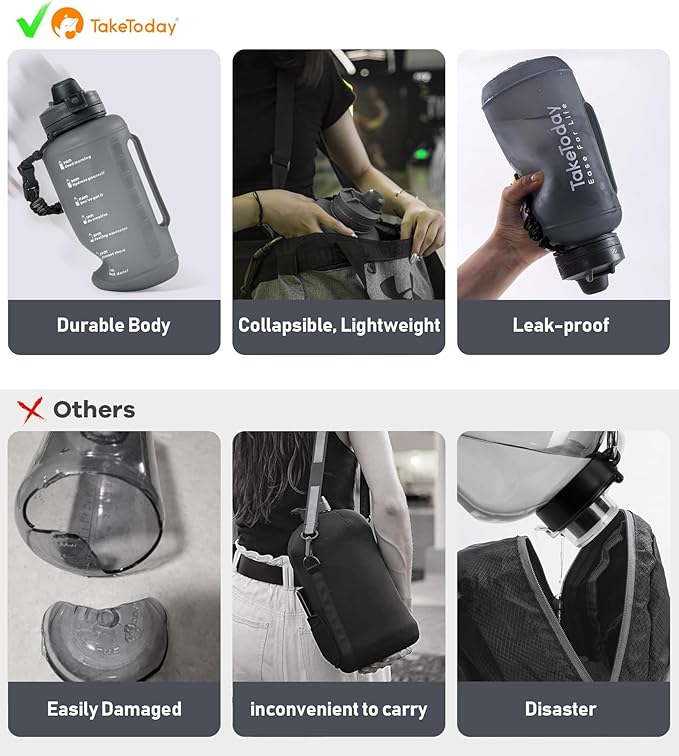• 6 MONTH WARRANTY - We are proud of the quality of our TakeToday half gallon collapsible water bottles and stand behind them with a 6-month limited warranty. If you experience any defects in materials or workmanship, our 24-hours customer service team will do our best to make it right.