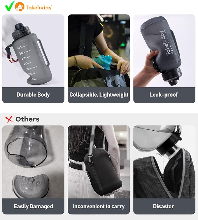 • 6 MONTH WARRANTY - We are proud of the quality of our TakeToday half gallon collapsible water bottles and stand behind them with a 6-month limited warranty. If you experience any defects in materials or workmanship, our 24-hours customer service team will do our best to make it right.