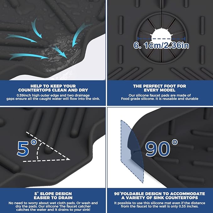 • đŸ’Ș【KEEP YOUR COUNTERTOP DRY】 Silicone faucets pad new designed for faucet splash with the draining, upgrading your kitchen sink & bathroom countertop in an effort-saving way! This means never gets soggy, or any water spots by the faucet. You don't need to worry about the water staying on the mat or counter.
