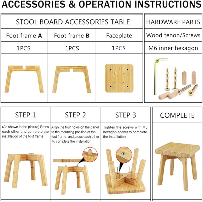 • Easy Assembly - This stepping stool comes with M6 allen wrench, screws, Wood tenons, silent anti-skid pads, and instructions. Standard size of each part makes it easy to assemble your step stool with simple tools. Easily and quickly installed according to the instruction.