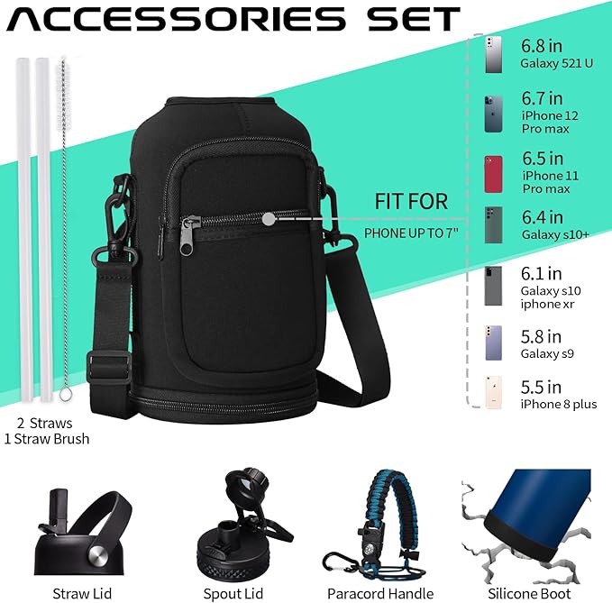 • PROTECTIVE BOOTS & STORAGE SLEEVE: Upgraded silicone boots prevent shattering and cracking when stainless steel water bottle accidental dropped. And storage carrying pouch with removable shoulder strap for convenient hands free carrying! The safe zippered pocket design to stores all your stuff, holds your cards & phone & key