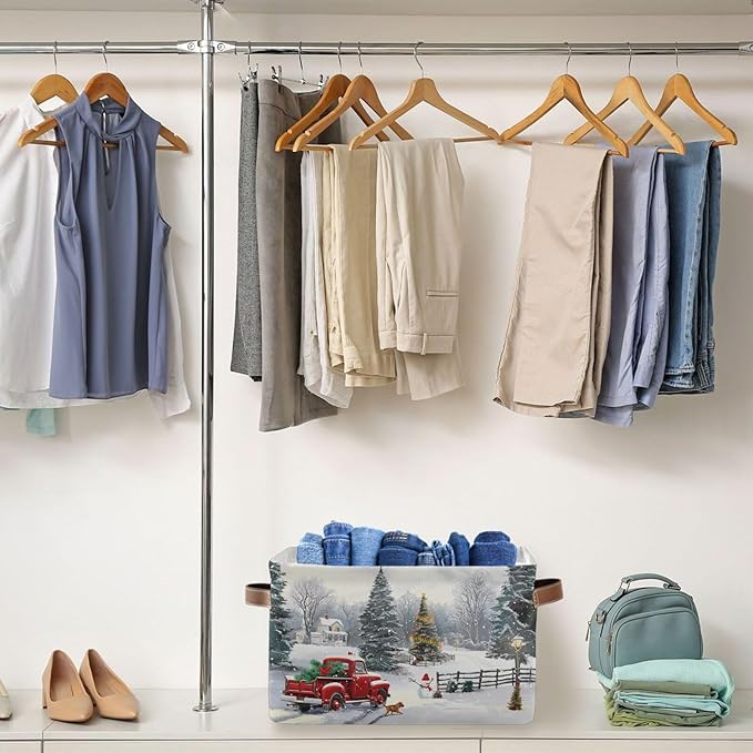 Christmas Tree Red Truck Storage Basket Fabric Laundry Baskets Winter Snowman Snowflake Golden Retriever Dog Storage Boxes Organizer Bag for Cloth Toy Book Storage Cubes Shelf Closet Bins 16×12×8