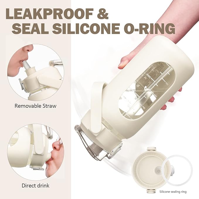 kytffu 42oz Glass Water Bottles with Straw, Motivational Glass Bottle with Silicone Sleeve and Time Marker, Leakproof Large Glass Water Jug for Gym Home Office,White