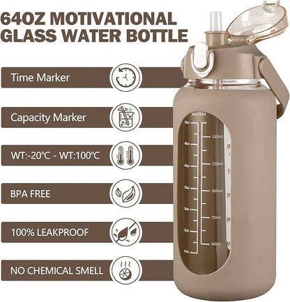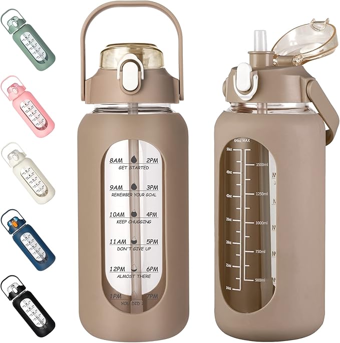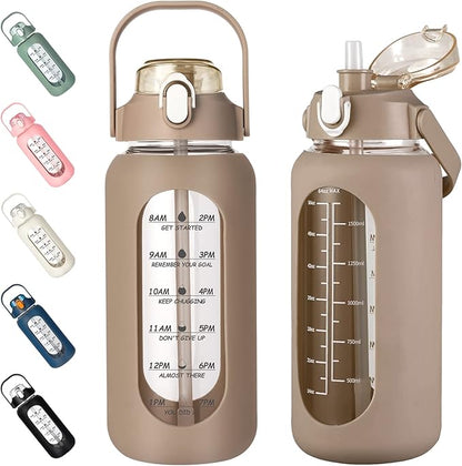 • ❤High-Quality Borosilicate Glass Bottle- This large motivational water bottle is made of odorless, quality, borosilicate glass. Straw and lid are made of food-grade PP, BPA-free and eco-friendly.