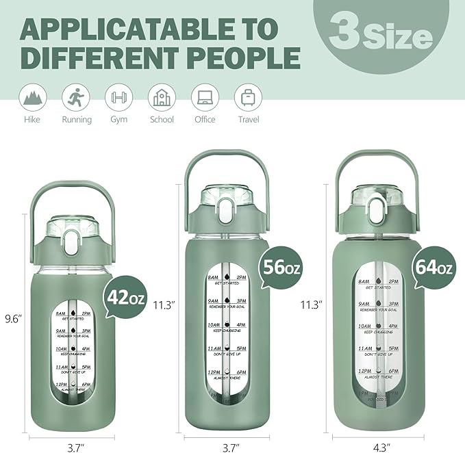 • ❤High-Quality Borosilicate Glass Bottle- This large motivational water bottle is made of odorless, quality, borosilicate glass. Straw and lid are made of food-grade PP, BPA-free and eco-friendly.
