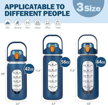 kytffu 64oz Glass Water Bottles with Straw, Half Gallon Motivational Glass Bottle with Silicone Sleeve and Time Marker, 2L Leakproof Large Glass Water Jug for Gym Home Office,Blue