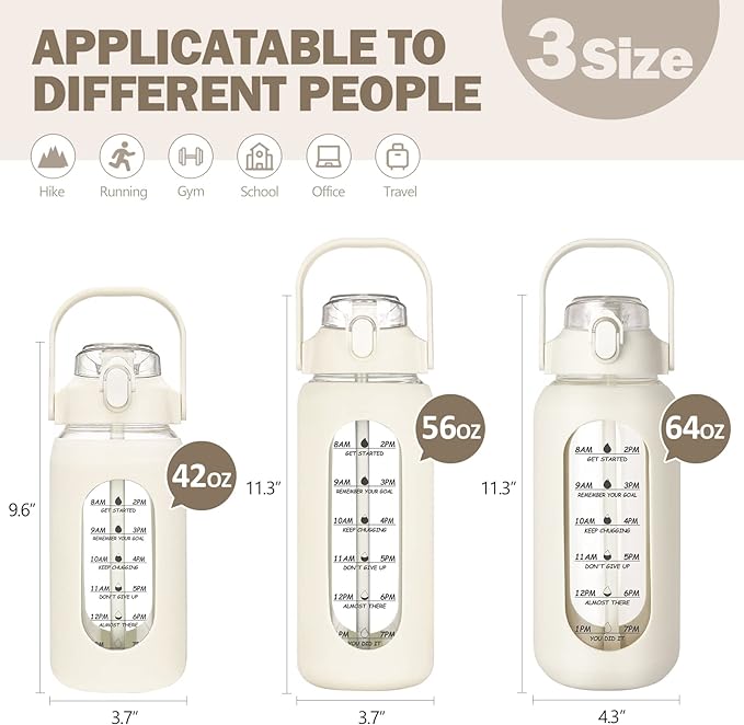 • ❤More Function- Our glass water bottle with stylish silicone sleeve which provides more grip and prevents the water bottle from slipping out. -This large motivational water bottle has a wide mouth, not only easy to hold ice cubes and fruit but also very easy to clean, you can use our complimentary cup brush to clean your water glass. -Handle on the lid for easy portability.