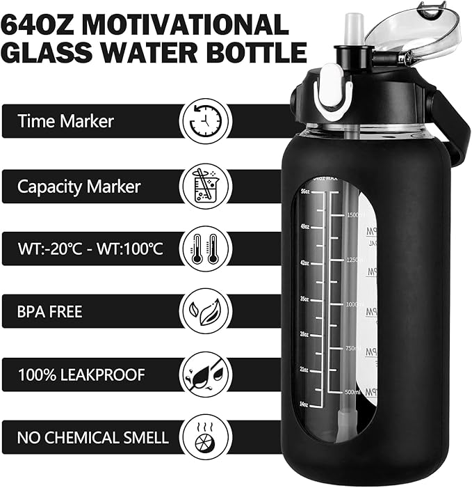 • ❤Glass Water Bottle with Pop-up Straw Lid- Our 64oz water bottle with straw is designed with an upgraded lid that ensures 100% leakproof and dustproof. Advanced one-click button makes you drink easier, just push the button and the straw will pop out automatically.