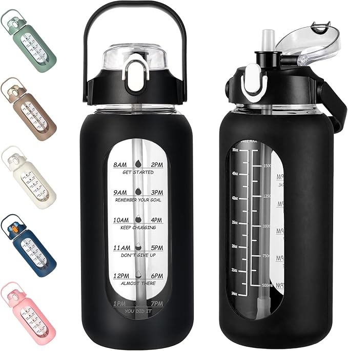 kytffu 64oz Glass Water Bottles with Straw, Half Gallon Motivational Glass Bottle with Silicone Sleeve and Time Marker, 2L Leakproof Large Glass Water Jug for Gym Home Office,Black