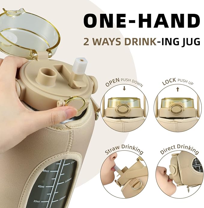 • Glass Water Bottle with Pop Up Lid : Our 42-64OZ glass water bottle with straw is designed with a pop up lid with silicone O-ring, secure lock & dust cover that ensures to be 100% leak-proof and dust-proof. This glass water bottle has two ways to drink water There's both a straw and a hole that can be drank from directly which is very convenient and fast