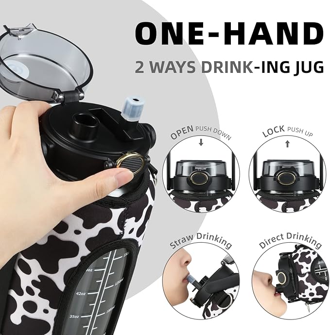 • Glass Water Bottle with Pop Up Lid : Our 42-64OZ glass water bottle with straw is designed with a pop up lid with silicone O-ring, secure lock & dust cover that ensures to be 100% leak-proof and dust-proof. This glass water bottle has two ways to drink water There's both a straw and a hole that can be drank from directly which is very convenient and fast