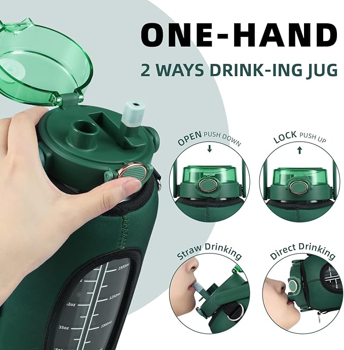 • Glass Water Bottle with Pop Up Lid : Our 42-64OZ glass water bottle with straw is designed with a pop up lid with silicone O-ring, secure lock & dust cover that ensures to be 100% leak-proof and dust-proof. This glass water bottle has two ways to drink water There's both a straw and a hole that can be drank from directly which is very convenient and fast