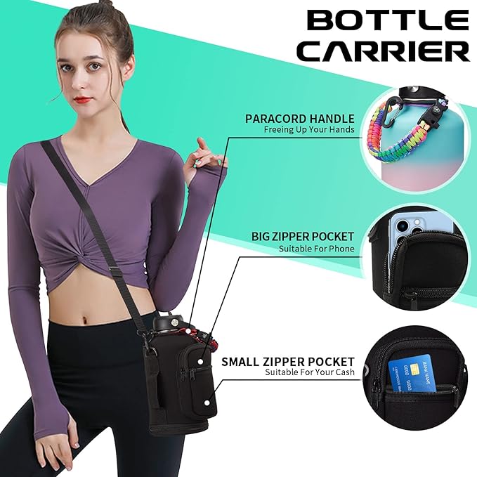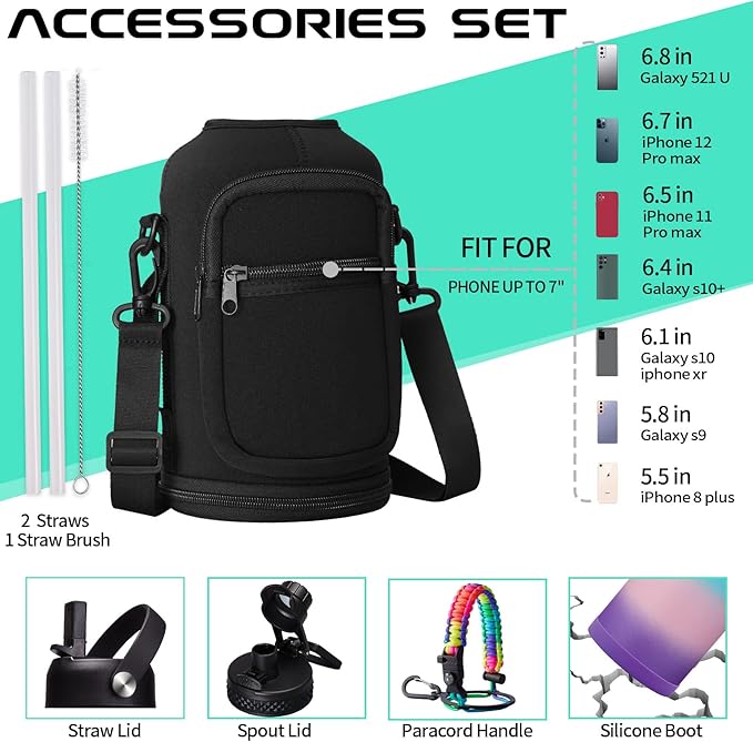 • PROTECTIVE BOOTS & STORAGE SLEEVE: Upgraded silicone boots prevent shattering and cracking when stainless steel water bottle accidental dropped. And storage carrying pouch with removable shoulder strap for convenient hands free carrying! The safe zippered pocket design to stores all your stuff, holds your cards & phone & key