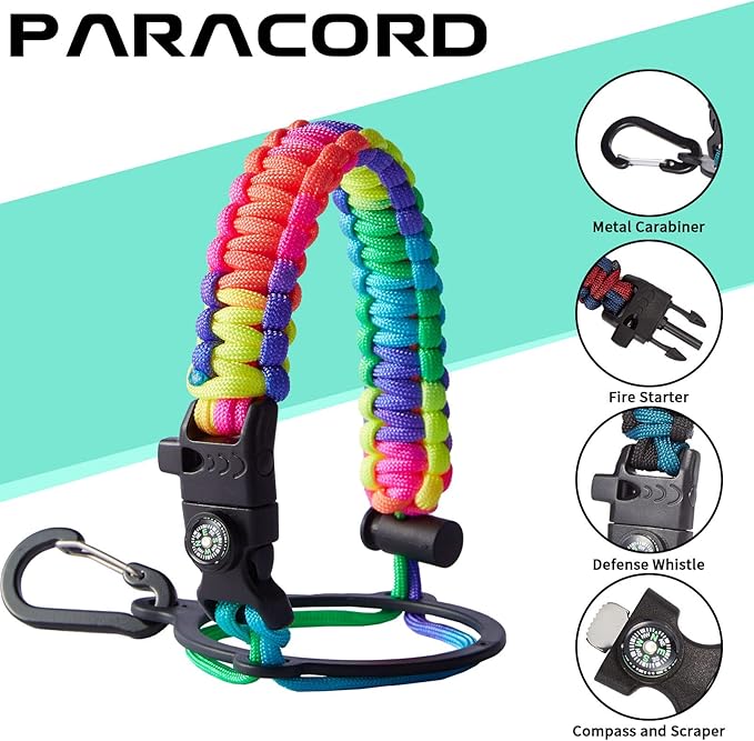 • UNIQUE DESIGNS PARACORD HANDLE: Full-function paracord handle made in individual styles to match the color of the flask water bottles. With compass, safety ring, carabiner, flint fire starter & whistle. It unravels into a sturdy and taut rope in an emergency, making the large water jug an ideal survival kit for expeditions in the wild