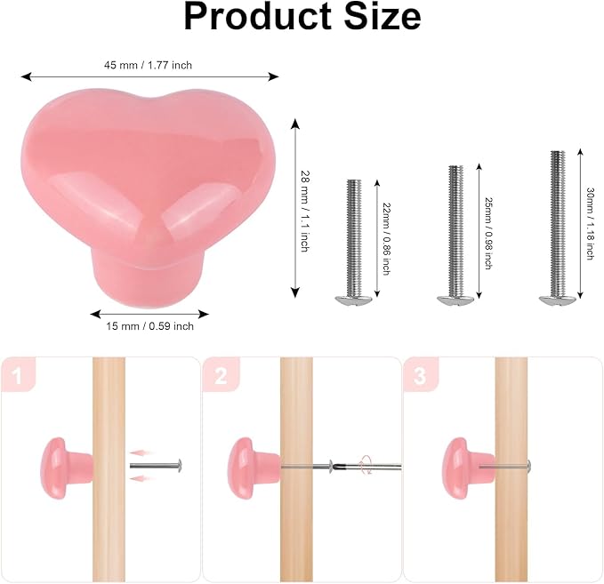 • 10 Colors: Beige, Red, Pink, Pale Pinkish, Light Pink, Blue, Light Yellow, Blue-green, Light Purple, Light Grey; Knob Size: approx. 1.77*1.1*0.59inch. Each sweet door knob comes with 3 sized M4 mounting screws in length: 22/25/30mm; Suitable for 15-25mm thickness board, which can satisfy your different installation needs.