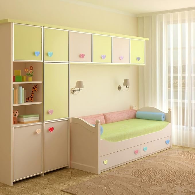 • Set of 10pcs delicate colorful door knobs of different colors, ideal for cabinet, drawer, chest of drawers, wardrobe, etc. Made of durable hard ceramic material, robust and sturdy, not easy to come apart. The love-shape cute cabinet knobs have fine touch, glossy and smooth surface, lovely bright multi-colors and definitely are great choice for children’s room decoration.