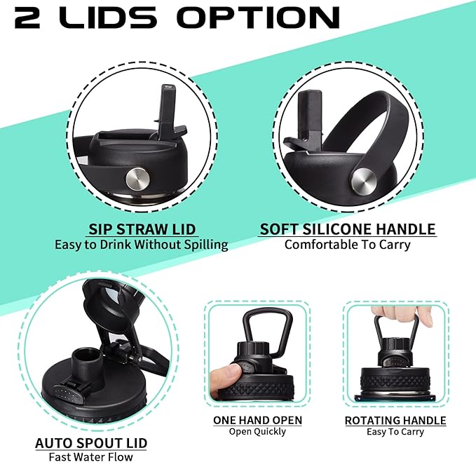 • 2 LID OPTIONS (Auto-spout & Straw): two different lids are complete LEAK PROOF & design for easy drink. The pops-up lid for easy drinking and seals shut for no leaks when you're on the go. The straw lid makes it easy to enjoy spill-proof sips, and package come with a alternative straw & a straw brush for easy cleaning